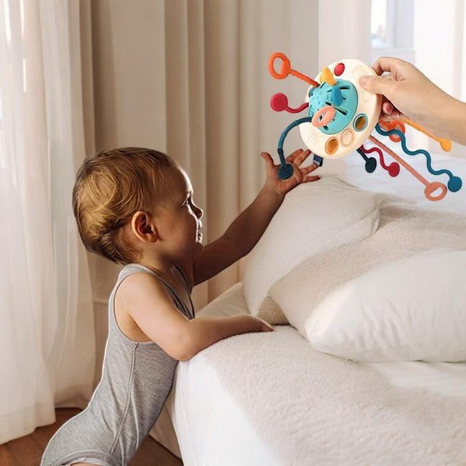 The intriguing UFO shape, combined with soft, textured-edged cords, creates an inviting grip for little hands. As babies pull the cords from side to side, they experience delightful sounds and vibrations that captivate their senses. This multi-sensory interaction reinforces motor skills, sensory exploration, and hand-eye coordination.
